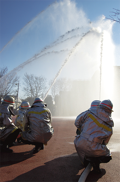 一斉放水演技で同消防団が快晴の青空に高々と放水のアーチを掛けると、来場者たちから「わー、きれい」と歓声が上がった。地域の中学生からなる「ジュニア・ハイスクール消防隊」は分列行進のほか、練習を重ねてきた放水演技を披露。未来の消防隊員たちの勇姿に、来場者らは大きな拍手を送った。