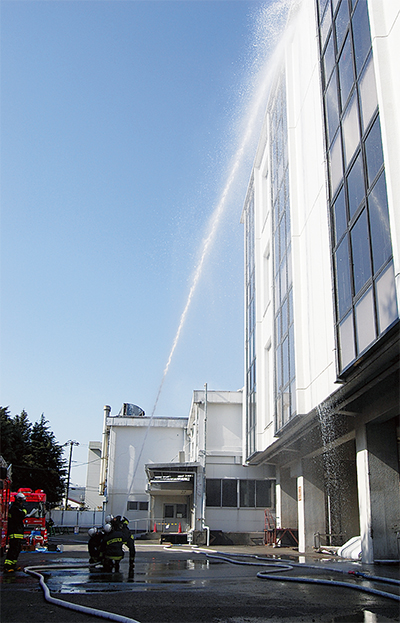 放水訓練では、4階建ての工場の上階での火災発生を想定。災害発生時における建造物の倒壊で消防車が火災現場に近接できない場合に備え、消火ホースをがれきの上に這わせながら効率的に鎮火できるよう、ホース30本をつないで水を噴き上げる手順を確認した。冬の空に高々と放たれた水は勢いよくしぶきを上げ、工場の屋上を越える高さまで到達した。