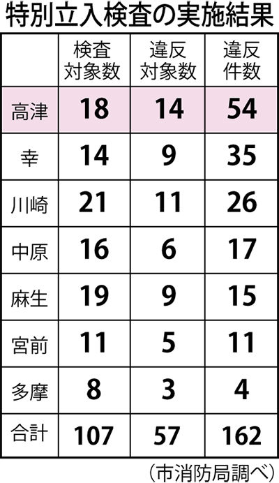 高津消防署(鈴木富夫署長)では同16日から31日まで、区内の計18対象で検査を実施。計14対象に違反が認められ、違反件数は54件で市内最多だった。