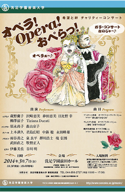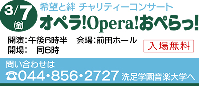 洗足学園音楽大学は3月7日(金)、同大学前田ホールで「希望と絆 チャリティーコンサート『オペラ! Opera! おぺらっ!』」を開催する。
