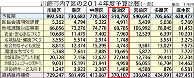 高津区の2014年度予算で前年比増なのは、道路維持補修事業費(1267万9千円増)や水路整備事業費(530万円増)など土木費が中心。一方、区民会議開催費は48万2千円減、地域課題対応事業費は170万7千円減だった。