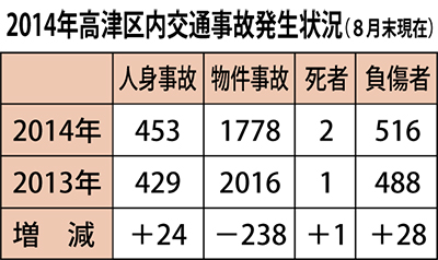 高津警察署交通課によると、交差点で発生する事故が最多で、自転車が絡むケースも増えている。「高津は平場が多く自転車人口が多い。また子どもの事故も減っていない。自転車、歩行者講習会など、区と連携し注意啓発を積極的に行っていきたい」と話している。