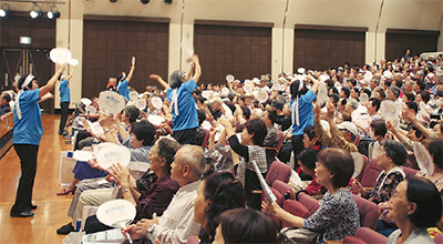 敬老会の式典には区内の高齢者が数多く来場。老人福祉活動功労の表彰などの後、ステージ上に「テントラちゃん」が登場した。さらに「川崎の歌姫」桜井純恵さんも出演してテーマソングを歌ったほか、ヘルスパートナー高津(高津区運動普及推進会)のメンバー10人がうちわを使った振り付けを披露。来場者も曲に合わせて体を動かし、会場は盛り上がりを見せた。