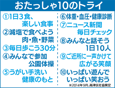 「おたっしゃ10のトライ」は、高齢者が健康で生きがいを持って暮らせるようにと、高津区社会福祉協議会(社協)が2014年9月に策定。「毎日歩こう30分」「ニュース新聞毎日チェック」など、おたっしゃ=元気で長生きするための健康目標10項目が設定されている。町内会や老人クラブの意見を参考にしながら、数字や具体例を盛り込み、高齢者が毎日達成しやすい目標を選んだという。