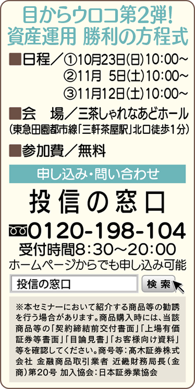 同社のセミナーは、これまで1000人以上が参加し、人気となっている。次回は「資産運用、勝利の方程式」をテーマにマーケットの流れに負けない賢い資産運用の方法と、大きな差がつく良い投資信託の選び方について解説する。日程、会場は左表、参加無料。定員になり次第締切なので、早めの申し込みを。
