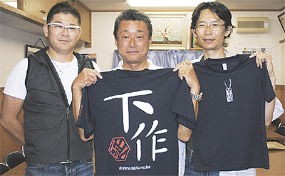 今回のTシャツ製作の発案者は、下作延連合青年会役員の曽呂学史さん(40)=中面・人物風土記で紹介。もともと地域活動が盛んな同地区でも昨今、町内会や子ども会に参加する世帯が減ってきている現状を何とかしたいという思いがきっかけ。これまで町会単位でTシャツなどを作ってきたことはあったが、地域全体の行事やお祭りでは一体感が出なかった。そこで「揃いのTシャツを作って連帯感を向上させよう」と連合青年会や連合子ども会に昨年提案した。話を聞いた連合青年会の山田勝二会長=写真中央=は「すごく良い話。神明神社の祭礼の際の神輿渡御などで皆が揃いのTシャツ着ていたら素敵だよね」と了承。当時子ども会会長を務めていた小野芳浩さん=写真右=も「子どもたちが思い出を共有し、この町を大切に想うきっかけになれば」と大賛成した。そこからTシャツのデザイン作りや価格設定などが始まり、このほどサンプルが出来上がった。