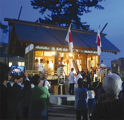 正遷座祭は、神殿を新しく造営、修理する時にご神体を移す祭儀。20年に1度執り行われる伊勢神宮の式年遷宮祭が知られている。 当日は、氏子や神職ら150人が参加。松明が灯される中、白い布で囲われたご神体が仮殿となった本殿左手の稲荷社から本殿へ戻された。本殿では、雅楽の演奏や舞姫による「豊栄の舞」が披露され、地域住民が見守る中、正遷座祭は盛大に執り行われた。