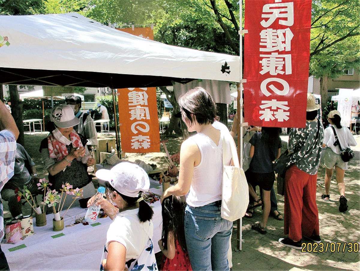 猛暑日予報の7月30日に4年振りとなる「高津区民祭」が実施され、私たち健康の森も図書館前広場の会場に出店しました。テレビで「(猛暑が予想されるため)不要不急の外出は控えてください」という注意がされる中、人出があるか心配でしたが杞憂でした。コロナ禍による制限の解除で区民の熱さが暑さを凌駕したようです。