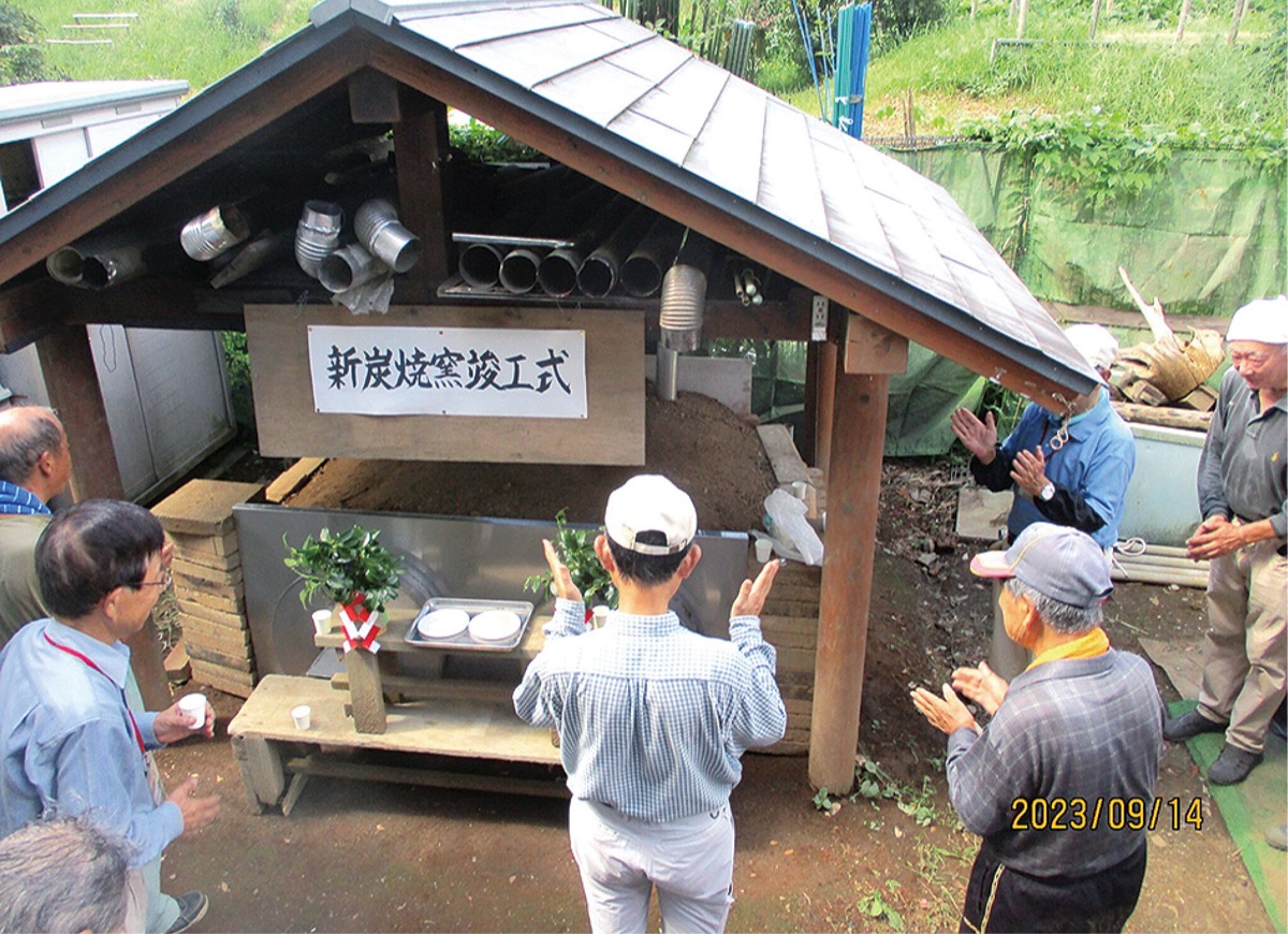 9月14日には新しい窯の前で「新炭焼窯竣工式」として皆で新しい窯の完成を祝いました。榊と紙垂を飾り、塩と米をお供えし、お神酒を頂きました。榊は森で調達、看板、紙垂は会員の手作りです。会長の音頭により道路公園センターさんへの感謝を捧げた後、かしわ手を打ち今後の竹炭焼きが安全に遂行され、竹炭が上手に焼ける事を願いました。10月には早速竹炭焼きの予定があります。気合が入ります。
