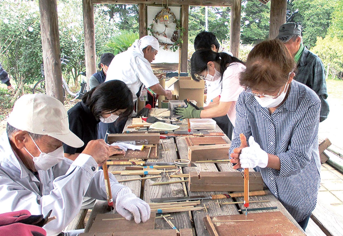 今年から始めた「木と竹細工教室」、10月5日に2回目を行いました。受講生は全員参加、熱心に取り組んで頂きました。今回は地元ケーブルテレビ局(イッツコム)の取材が入ることになり内容が少し変更となりました。当初は竹ひご作りや竹ひごを使ったコースター作りを予定していましたが、急遽、ノコギリ、キリ、小刀をすべて使う「ガリガリトンボ作り」となりました。