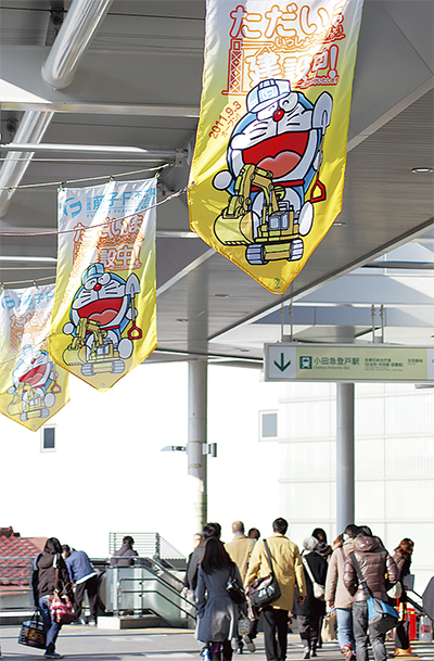 ドラえもんが現れたのは登戸駅のペデストリアンデッキに掲げられた広報用のバナーフラッグ。縦1・5メートル、横80センチのフラッグには、ヘルメット姿のドラえもんと重機のイラストが描かれ、乗り換え利用者に建設が進む様子をアピールしている。かわいらしいそのデザインに足を止めて眺める人もいた。3月1日まで掲出される。