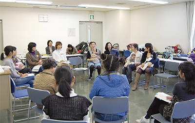 この日、集まったのは同会のメンバー7人に加え、30代から40代を中心とした地元で子育てをするお母さん24人。同助産院の藤井よし江院長が講演で出産や子育てに向き合うための母親の心得について説き、お母さんたちが出産体験を話し合った。