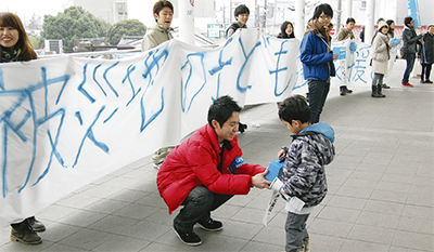 「被災地の子どもたちの支援を」。30人を超える専修大学の学生が21日、登戸駅のペデストリアンデッキで呼びかけた。