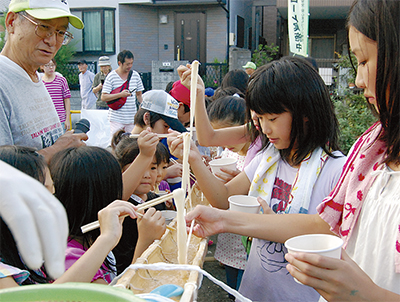 生田6丁目公園で先月28日、「こども夏祭り」が開かれ、近隣の子どもたちが流しそうめんやスイカ割りを楽しんだ=写真。