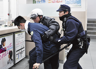 強盗訓練は刃物を持った男が窓口で金を要求するという想定。警察官が到着するまで時間を稼ごうと、窓口の行員が現金の準備を遅らせるやり取りに挑戦した。警察官2人が本物の事件さながらに犯人役を取り押さえた。
