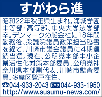 私は昨年6月の市議会定例会での一般質問の際、こうした魅力ある多摩区のまちづくりや、JR南武線と並行して川崎市を縦断する公共交通機関として、登戸〜向ヶ丘遊園跡地〜川崎〜羽田国際空港を結ぶモノレール建設の構想などを大きな視点で幅広く語り、福田市長の見解を求めました。
