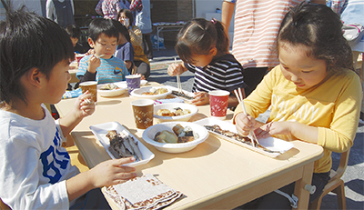 子どもたちに食事や命について関心をもってもらおうと、こどもの丘保育園(宮前区菅生)で14日、園児たちがサンマの塩焼きを野外で食べる催しが行われた。