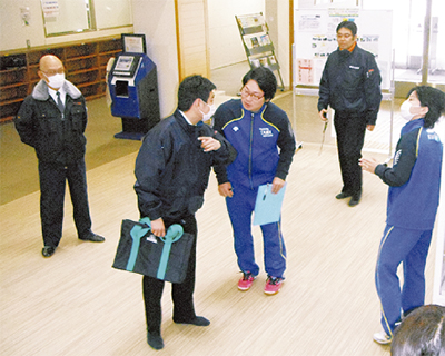 入口からナイフを隠し持った不審者が侵入してきたという想定で行われ、スタッフが対応した。警察から、受付での接し方や男性職員の配置、通報のタイミングなどのアドバイスを受け、2回目のシミュレーションを実施。さすまたを使用して無事犯人役に扮した警察官を取り押さえた。