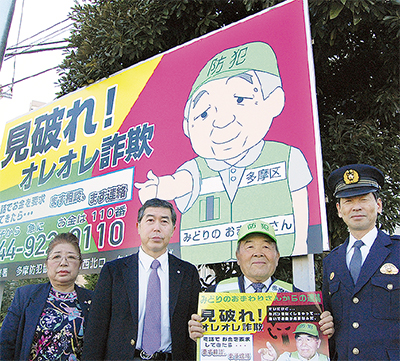 寺澤署長は「看板設置による被害防止の効果に期待したい」と話す。多摩防犯協会は昨年、振り込め詐欺の急増を受け新たに啓発ポスターを製作。区内の掲示板や小田急バス内への掲出など積極的に被害防止を訴え、被害件数減少の一助を担ってきた。