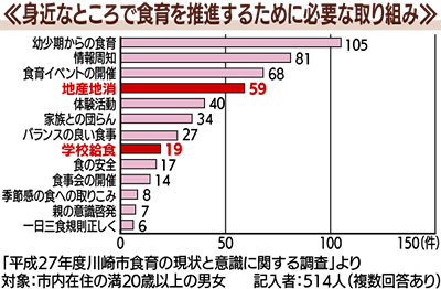 教育面では、今年中に市内全校で始まる中学校給食において「地産地消」の取組が進められます。今年3月に改訂された第4期川崎市食育推進計画では、中学校における食育の目標のひとつに「『食』に関する指導等を通じて、地域への『愛着』と『理解』を深め、生産者等への『感謝』の心を育む」と記載されました。これに準じて、市内産の農産物を中学校給食の統一献立で使用するなど「地産地消」を推進していきます。