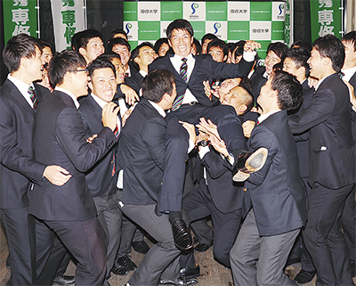 プロ野球の新人選手選択(ドラフト)会議が先月26日に都内で行われ、専修大学商学部4年の高橋礼投手(22)が福岡ソフトバンクホークスから2位指名を受けた。高橋投手は東三田の生田キャンパスで会見を行い、硬式野球部(部長・佐々木重人学長)の齋藤正直監督(57)や仲間たちと喜びを分かち合った。