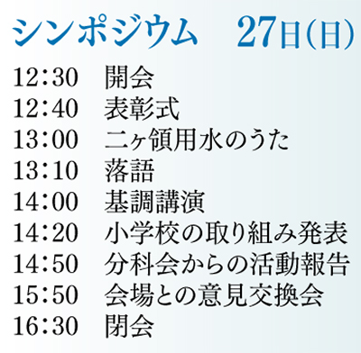 翌日27日(日)には、ニヶ領用水竣工400年記念シンポジウムが同じく市民館で行われる。主催は二ヶ領用水竣工400年記念事業実行委員会(長島保実行委員長)、市建設緑政局。時間は午後12時30分から。