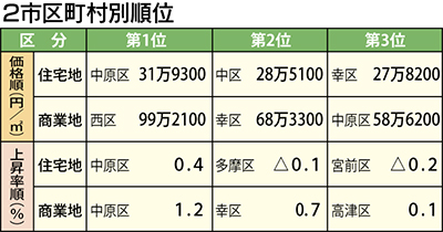 中原区の住宅地は、県内で唯一上昇、プラス0・4%となった。平均価格も県内トップで31万9300円(前年31万2900円)。県土地水資源対策課では「武蔵小杉の再開発が進んだことで街が変わり、東京から近く交通利便性にも優れていることが要因」としている。