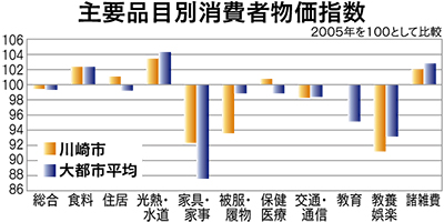 1人当たりの年間所得は東京都に次いで高い348万7千円で、大都市平均300万5千円を約48万円上回った。さらに2人以上の世帯で勤労者世帯1世帯あたりの平均1カ月間の実収入(64万2802円)と同消費支出金額(33万3360円)で、いずれも大都市の中で最も高いことが分かった。消費支出では住居と保険医療が多いのが特徴で、住居費が占める割合は8・7%と横浜市に続いて高い。居住専用住宅の1平方メートル当たりの工事費用額が東京都に続いて2番目、賃貸住宅家賃が民営で2番、公営で3番目に高いことが影響しているようだ。