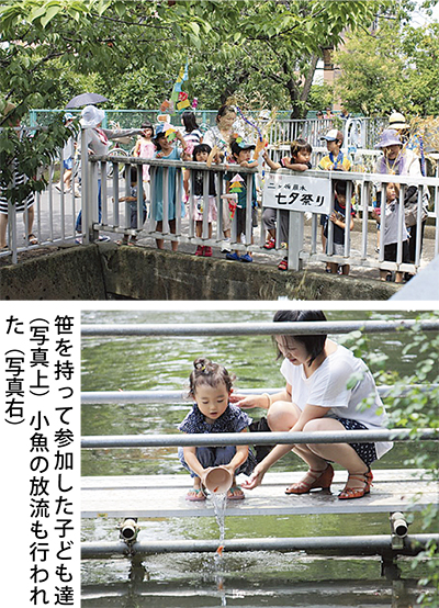 会場には、笹を手にした子どもと、その保護者ら約300人が参加。「ピアノが上手になりたい」「サッカー選手になりたい」「病気が治りました。ありがとう。これからも家族みんなが健康でありますように」などの短冊が付いた笹を参加者は二ヶ領用水に流し、その後、小魚の放流も楽しんだ。イベントの最後には同会が育てた桃が配られ、参加者は「中原でも桃がとれるんだ」と感心していた。