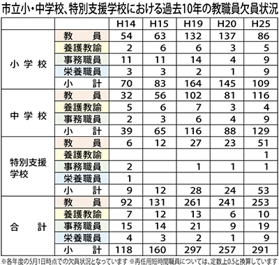 これまで3回にわたり、人口増に伴なう中原区の教育の現状について述べさせていただきました。主たる内容は、児童生徒数の増加に対し普通教室が不足している事、及び学校敷地面積の整備基準に満たない学校が多い点についてでありました。今回は本市における教職員の欠員状況について述べさせていただきます。