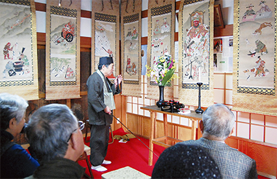 区内下小田中の安楽寺(宗澤文良住職)で1月16日、江戸時代の中期に描かれた六道地獄絵について解説する「絵解き口上」が行われ、大道芸研究会会長の麻布十兵衛氏(本名:栢木興太郎)が地獄という世界やそこでの罰などについて語り、来場者を楽しませた。