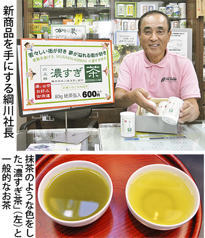新商品「六三四 濃すぎ茶」は、(株)つな川が昭和30年から40年頃まで販売していた味の濃い日本茶。「川崎は労働者のまち。戦後は特に味の濃いものが求められていて、日本茶も同じだった」と綱川健一代表取締役は話す。復刻は、武蔵小杉にあやかり「お茶を通じたまちおこしができないか」と考えたことがきっかけ。