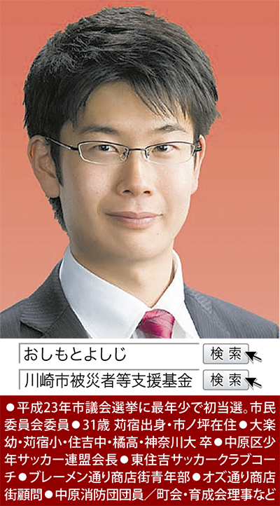 本市は、川崎フロンターレのように日本有数のJ1リーグチームをはじめ、ホームタウンスポーツを多く抱える自治体です。特に中原区は、行政区単独で他のJリーグホームタウンに並ぶ人口規模を誇り、等々力緑地や多摩川河川敷などのスポーツ施設や環境にも恵まれ、多くの区民が少年スポーツから生涯スポーツに打ち込んでいます。スポーツは、青少年の心身の健全育成を促し、スポーツを通じて地域の人々が交流を深め、住民相互の新たな連携を促進します。そして、住民が一つの目標に向かい、ともに努力し達成感を味わうことで地域に誇りと愛着を感じ、『郷土愛の醸成』に繋がります。そのような効果を最大限活かすため、既存施設の充実はもちろん等々力陸上競技場第2期バック・サイドスタンド改築工事実現・等々力プール併設と等々力硬式野球場の着実な整備を促し、スポーツ振興・環境整備を着実に推進します。さらに、2020年東京オリンピック・パラリンピック開催を見据えたキャンプ誘致やスポーツ振興施策に取り組むため、外国人や障害者にも優しい”ダイバーシティ”(多様性)のまちづくりを推進することで、人の賑わいを創出し、商店街など地域活性化の起爆剤にして参ります。