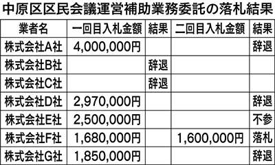 これまでの取り組みは報告書やインターネットで見ることができますので参照頂きたく存じます。特に中原区の区民会議については私見ではありますが、市内7区の中では特質した取り組みと実績を上げていると申し上げられます。しかし残念ながらこの区民会議の認知度は低く市民アンケートでは25・5%との結果が出ています。別表をご覧頂くとお分かりになりますが実はこの区民会議の運営は、指名競争入札で落札した業者に業務委託されております。その主な業務内容は、区民会議全体の運営及び企画の補助、専門部会の運営補助・企画の補助、資料の作成、報告書・広報紙の作成等となっています。平成26年度はF社が落札しています。ちなみに平成25年度はD社が173万2500円で落札、平成24年度はE社が194万2500円で落札、平成23年度もE社が196万3500円で落札しております。入札に不正は無いと信じますが市民の税金を投入する以上、効果的な委託業務であって欲しいと考えます。特にこれまでの委託業務内容の中に区民会議の認知度を上げるという項目がありません。報告書・広報紙がそれに当たるとも考えられますが充分ではありません。認知度を向上させることも委託業務の中に加えるべきと提案いたします。併せて指名競争入札に限ることなく他の入札方法も検討すべきではないでしょうか。プロポーザル方式なども考えられます。