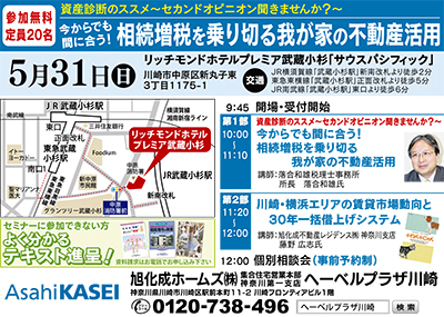増税時代の今、資産活用の悩みや疑問に応えて賃貸経営を成功に導くきっかけにしてもらおうと、旭化成ホームズ(株)では5月31日(日)、午前10時からリッチモンドホテルプレミア武蔵小杉で無料賃貸経営セミナーを開催する。