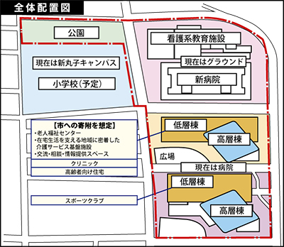 今回市から発表された開発方針では、「都市型の地域包括ケアシステムの構築」を実現する為、川崎市と日本医科大学が協力して行い、現在病院が建つ敷地の他、グラウンド、キャンパスも合わせて開発される予定で、医療と福祉機能を併せ持つ一体的な整備が進められる事が発表された。