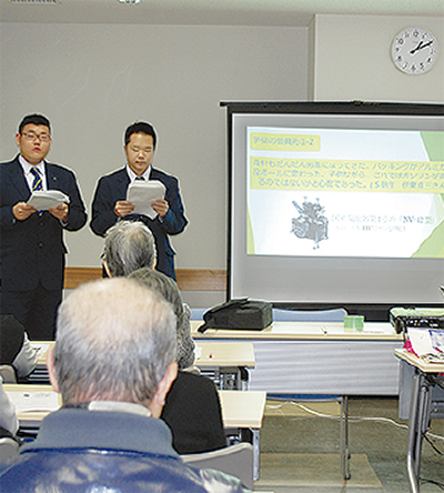 期間中は同館市民ギャラリーに平和への思いを伝える絵手紙や短歌などが展示された。また5日には法政二高の社会科学歴史研究部に所属する2年生3人が「軍需工場のまち川崎と学徒勤労動員」をテーマにした研究発表を実施=写真。高校生らは「戦後70年の今を生きる私たちが、様々な戦争の記憶や思いを受け止め、未来へと繋いでいく必要性があるのではないか」と述べた。