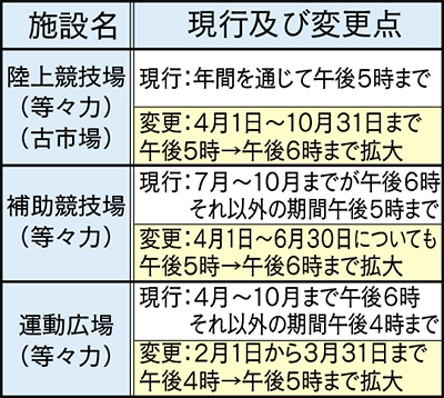 本市においては、人口密度が高く、市域が限られる中で、既存施設の有効活用が喫緊の課題であり、その取り組みを促して来ました。昨年末の定例会では、等々力緑地内における運動施設の供用時間について、夏期と冬期で終了時刻にバラツキがあり、見直し及び拡充を図るべきと指摘、その実現を要望しました。私の質疑に対し建設緑政局長は、「利用者ニーズに合った環境整備に向け検討して参りたい」と答弁し、この間、見直し案の検討が行われて参りました。その後、今夏に常任委員会へ見直し案が報告。今秋に市民意見の募集・取りまとめが行われ、今月27日開会の第4回定例会に都市公園条例の改正案が提出される運びとなっています。(※表1)