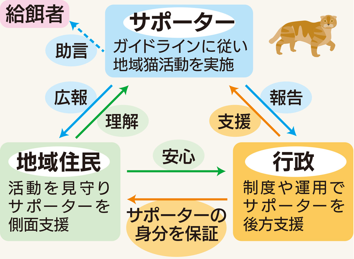市のサポーター登録には「市内在住者を含む2人以上」などの条件もある。市内で野良猫の繁殖制限に取り組むボランティアの一人は「行政のお墨付きがあれば心強いと思う一方、新たに始めたい人が挫折してしまわないか心配。改善しながら、前向きに進めてもらえたら」と話している。