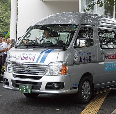 高石地区のコミュニティバス「山ゆり号」の運行開始を記念した出発式が今月1日、生田病院(多摩区西生田)で行われた。式典には運行の準備を進めてきた「山ゆり交通事業運営委員会」のメンバーをはじめ、齋藤力良副市長など多くの来賓が集まり、市内初となる住民主導のコミュニティバスの門出を祝った。