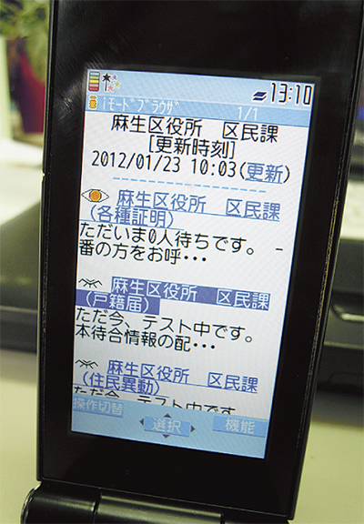 今回のシステム導入は、窓口が混み合う春の転入転出シーズンに先駆けて行われる。この「あさおWINシステム」の運用が始まると、受付は発券機を通して行われる。順番が来ると窓口に設置された電光掲示板に番号が表示されるほか、その場を離れても、番号札に記されているQRコードを介し携帯電話やパソコンから待ち人数や混み具合などが確認できるようになる。電光掲示板には行政情報や広告放映なども表示され、待ち時間の間に様々な情報を確認することができるという。