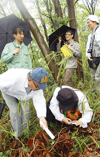 川崎市建設緑政局緑政部緑政課と富士通株式会社の社員が先月27日、区内栗木にある「栗木山王山特別緑地保全地区」で生態系の調査を行った。冷たい雨が降りしきる中、職員らは独自のチェックシートとGPS機能付き携帯電話を使い、緑地の実態を記録していった。
