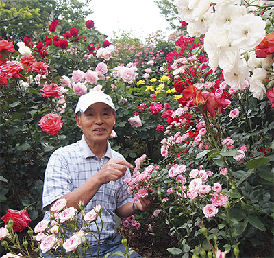 大坪さんが高石の自宅付近で園芸を始めたのは約30年前。高石に越してきて間もなく、地主の許可を受けて駐車場の隅でイチゴや山野草の栽培を開始した。約25年前からバラを植え始め、現在は大半をバラが占めている。近隣住民の依頼を受け、樹木の手入れを請け負うことも多いという。