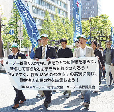 川崎地域連合の「第84回メーデー川崎地区大会」が先月27日、川崎球場(川崎区富士見)で開催され、労働組合60団体7800人(主催者発表)が参加した。勤労者と市民の結集を呼びかけたメーンスローガンの下、働きやすく住みよい街かわさきの実現と東日本大震災からの復興と再生にむけた支援を訴えた。
