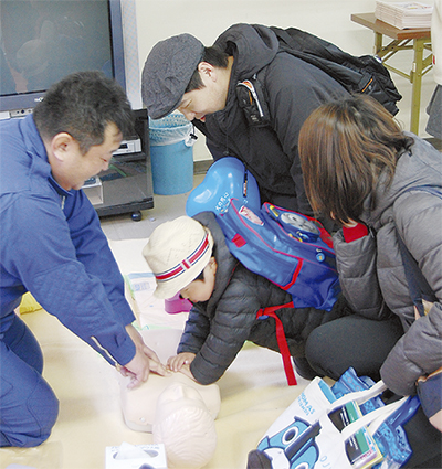 子どもに最も人気だったのは消防車等見学コーナー。ポンプ車やはしご車に乗り込み、満面の笑みで記念撮影する姿が多く見られた。救急体験コーナーでは同署署員らのアドバイスを聞きながら心臓マッサージを熱心に学んでいた。