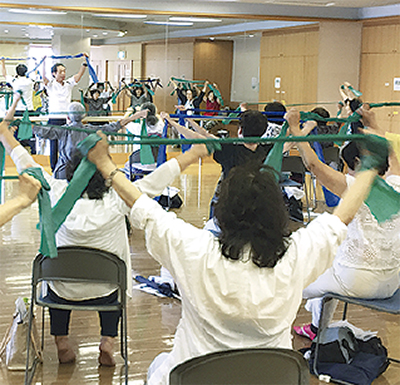 伸縮性のあるゴム製のセラバンドを使い、座ったままできる介護予防体操。当日はリハビリテーションの専門家・理学療法士がやり方を教えてくれる。