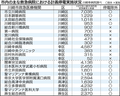 同病院は川崎市消防局だけでも市内2位となる年間4587件の救急患者の受け入れを行っている救急病院。実は市内で2千件以上の救急患者の受け入れを行う病院の中で計画停電から除外されていないのは、同病院だけ。幸区内で計画停電から除外されている病院は一つもなく、停電が行われた日の同病院に隣接する病院ではかなりの無理を強いられたようだ。