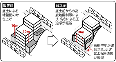 今回示した条例改正案では、高さを「盛土前からの高度地区の制限に適合」とする項目を追加し、地盤面をかさ上げする意図的盛土のメリットをなくした。さらに「敷地上部3分の2において盛土する部分については、隣地境界線から緩衝空地を確保」の項目も追加し、緩衝空地では擁壁や機械式駐車場などの構造物の設置を制限する。