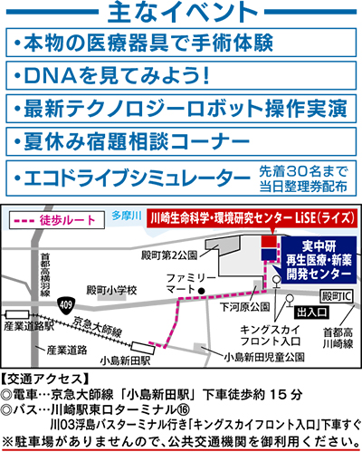 会場は、川崎生命科学・環境研究センター(LiSE)と実中研 再生医療・新薬開発センター。午後1時から4時まで。入退場自由。無料。事前申込不要。