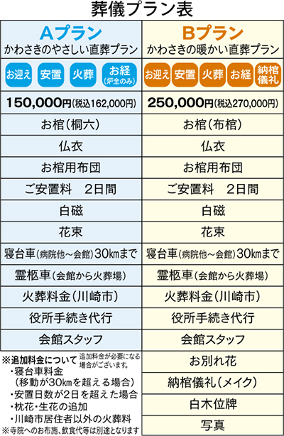 あすなろが用意したプランは『かわさきのやさしい直葬プラン(15万円・税別)』と『かわさきのあたたかい直葬プラン(25万円・税別)』の2種類。シンプルにしたい場合は「やさしい」プラン、お別れの花や、納棺儀礼(メイク)、白木の位牌など、よりお見送りを大切にしたい場合には「あたたかい」プランがお勧めとのこと。